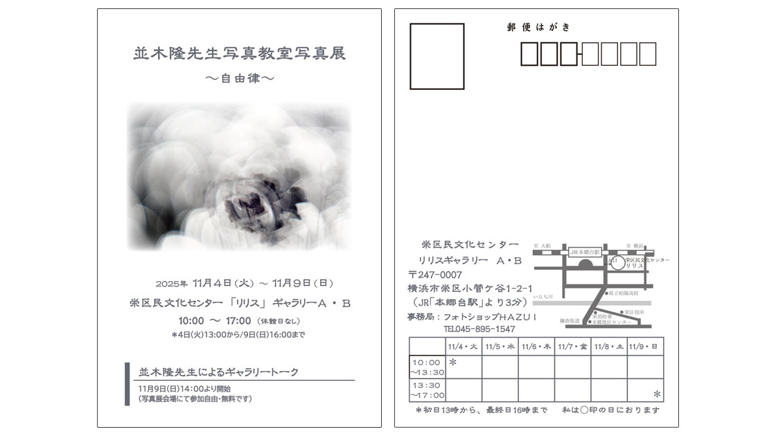 兼ねてから通っている並木隆先生の写真教室の写真展に参加します。